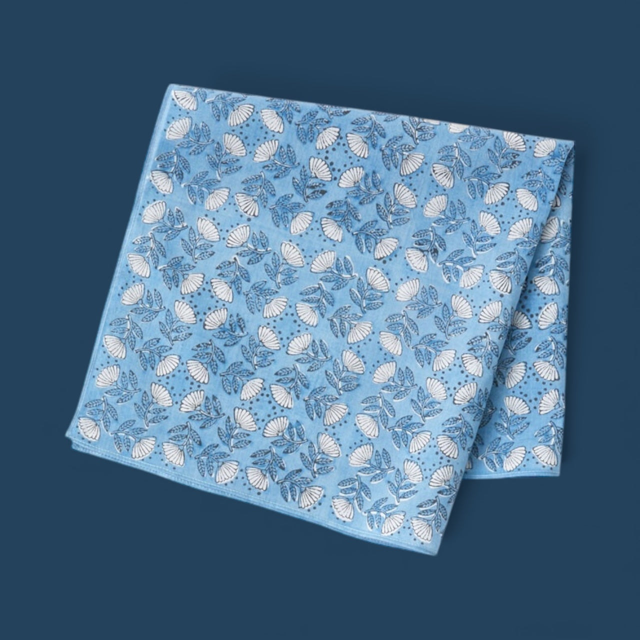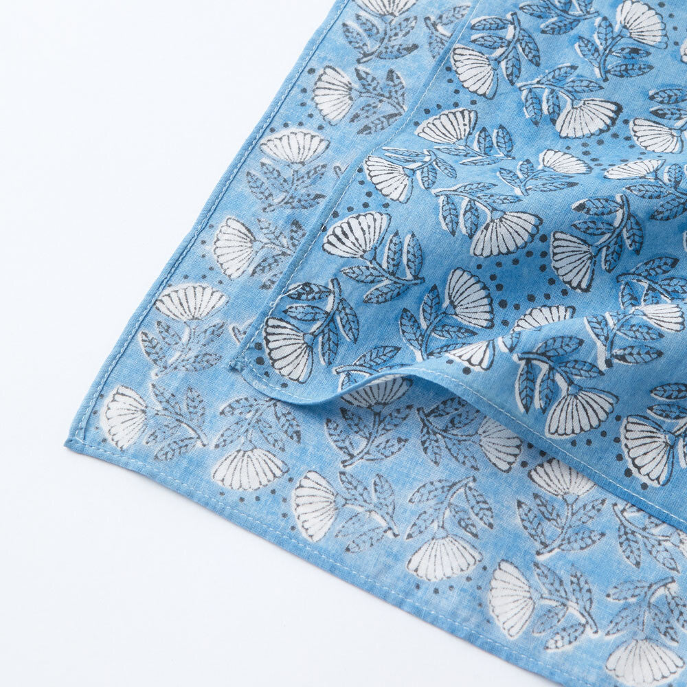 澄んだ青、やわらかなピンクの上に、可憐に咲く花々と葉を繊細に描いたブロックプリントのハンカチ。